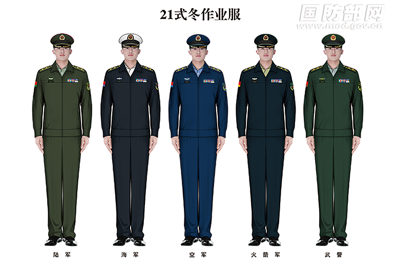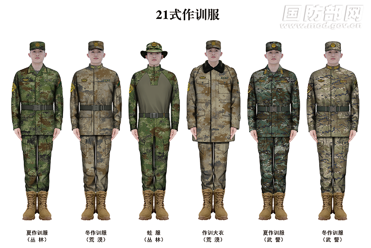 21式作训服和作业服是构建具有我军特色新时代军服体系的重要组成部分。21式作训服主要包括迷彩作训服、特勤作训服和作战靴,用于作战、训练、战备、执勤、遂行非战争军事行动任务时穿着。迷彩作训服区分丛林、荒漠等颜色;特勤作训服包括舰艇、空勤和地勤作训服,满足特殊岗位人员需要;作战靴(鞋)区分通用和专用。21式作业服是我军军服调整优化的新系列,采用夹克款式设计,区分春秋、冬作业服,运用新的军种颜色,配套大(卷)檐帽、作业服皮鞋等品种,用于办公等一般性日常活动时穿着。