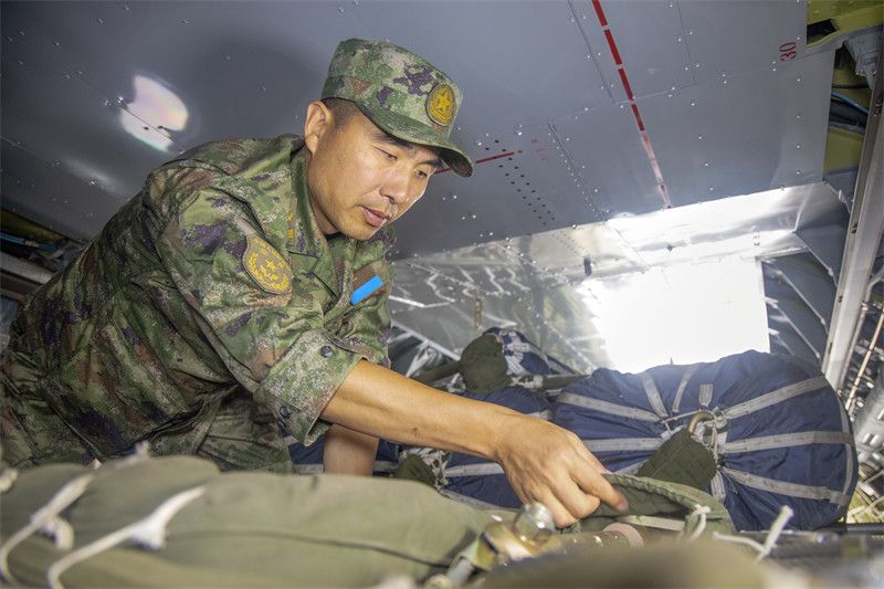 官兵们随即进行捆绑、定位、挂牵引伞等空投前的工作,并反复检查,仔细校正吊装、锁定、连接等每一个环节,确保空投安全顺利。
