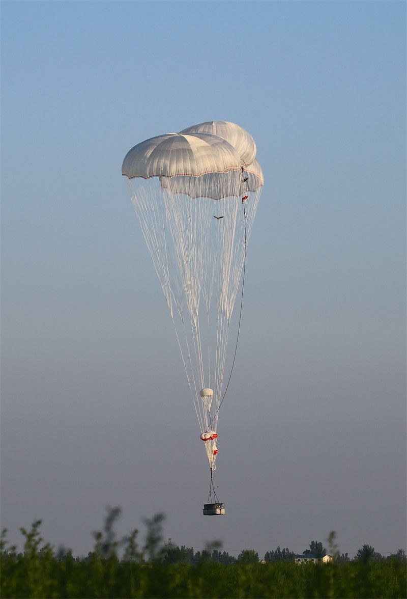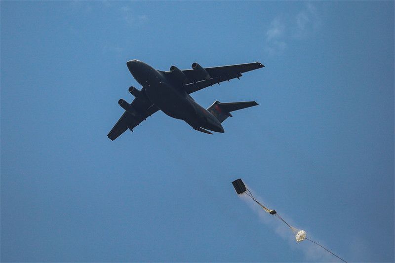 “101,投下、投下……”收到地面引导分队的指令后,机组人员按下投放按钮,在牵引伞的强大拉力下,重达数吨的物资装备在几秒钟内就被拉出了机舱,巨大洁白的伞花顿时在天空中绽放。此次重装空投使用多具圆伞,每具伞的面积达760平方米,相当于两个篮球场大小。数分钟后,降落伞精准降落到预定空投地点。